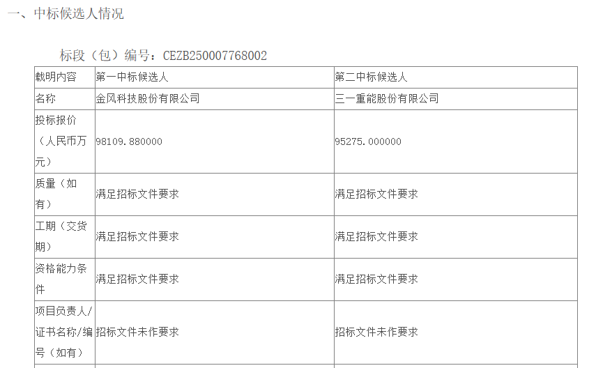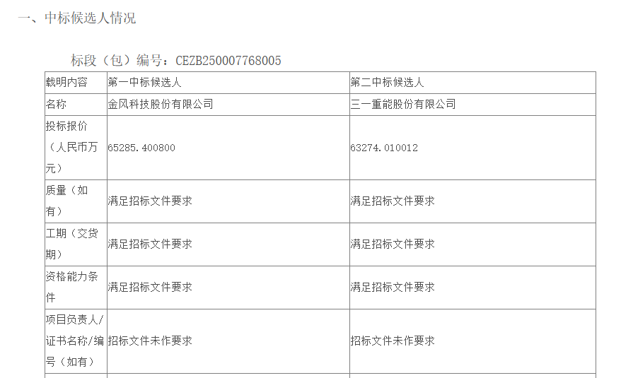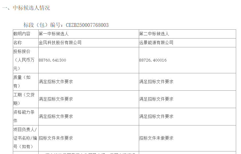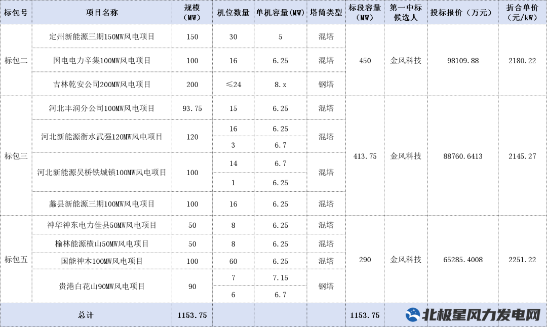 北极星风力发电网获悉,12月1日,国家能源集团招标平台发布《2025年第2批风力发电机组集采公开招标项目中标候选人公示》,此次开标覆盖标段二、标段三、标段五三大核心标段,总采购容量达1153.75MW。公告结果显示,金风科技凭借技术与成本综合优势,成为三个标段的第一中标候选人,总投标报价25.22亿元,再度夯实其在国内风电整机市场的头部地位。