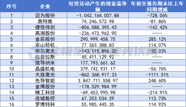 从应收账款来看,迈为股份、奥特维、捷佳伟创、高测股份、金辰股份等15家企业的总应收账款高达517亿元,大族激光以96亿元居首,12家企业应收账款规模在逐年扩大,仅高测股份、金辰股份、先导智能三家企业应收账款金额在减少,行业整体资金回笼压力可见一斑。