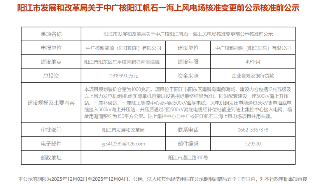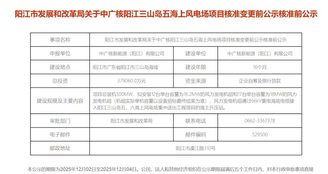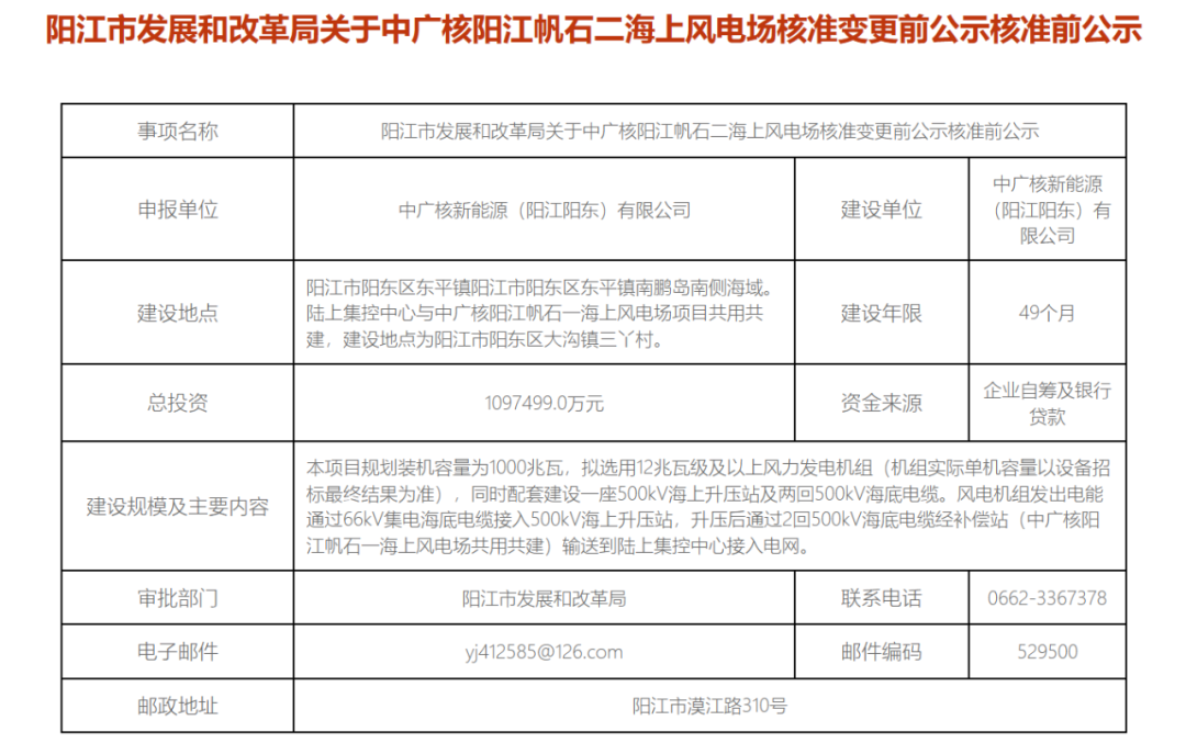 该项目总投资379060.0万元,建设单位为中广核新能源(阳江)有限公司,建设年限16个月。