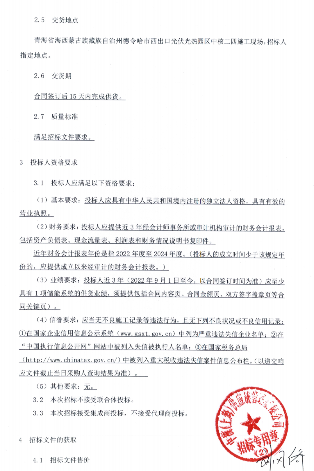 项目要求投标人近3年(2022年9月1日至今,以合同签订时间为准)应至少具有1项储能系统的供货业绩。