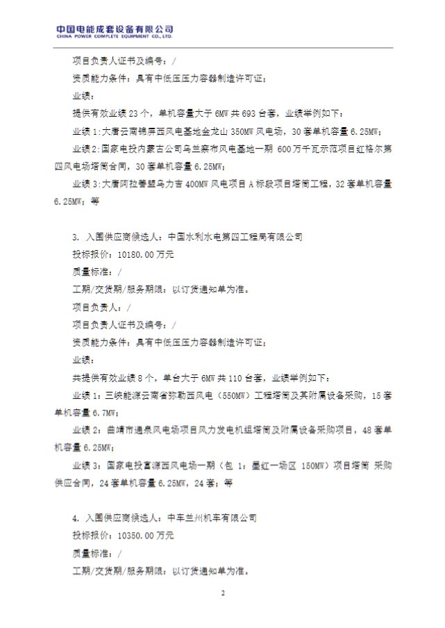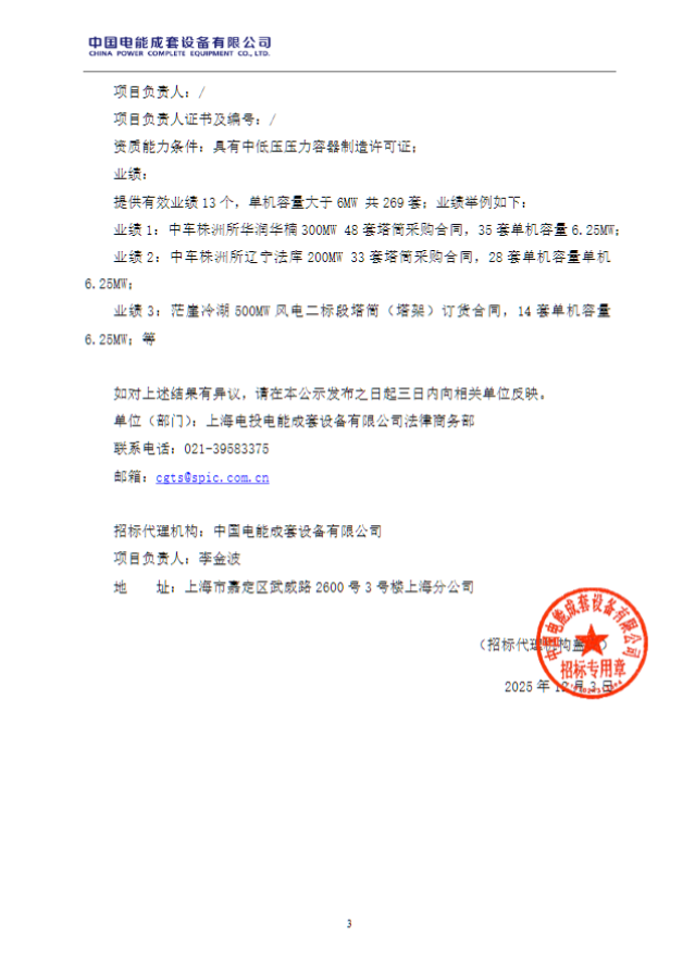 北极星风力发电网获悉,12月3日,上海电投电能成套设备有限公司二〇二五年度市场化项目第一批风电钢制塔筒框架采购入围供应商候选人公示。