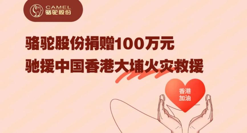 骆驼集团股份有限公司于2025年12月2日通过中华慈善总会向受灾地区捐赠人民币100万元。这笔捐款将用于受灾居民的医疗救助、紧急安置、过渡期生活救助等救援工作。骆驼股份将与香港同胞携手并肩、同舟共济,共同抵御这场突如其来的灾难。同时,其向火灾中遇难者致以深切哀悼,向奋一线救援力量致以崇高敬意。