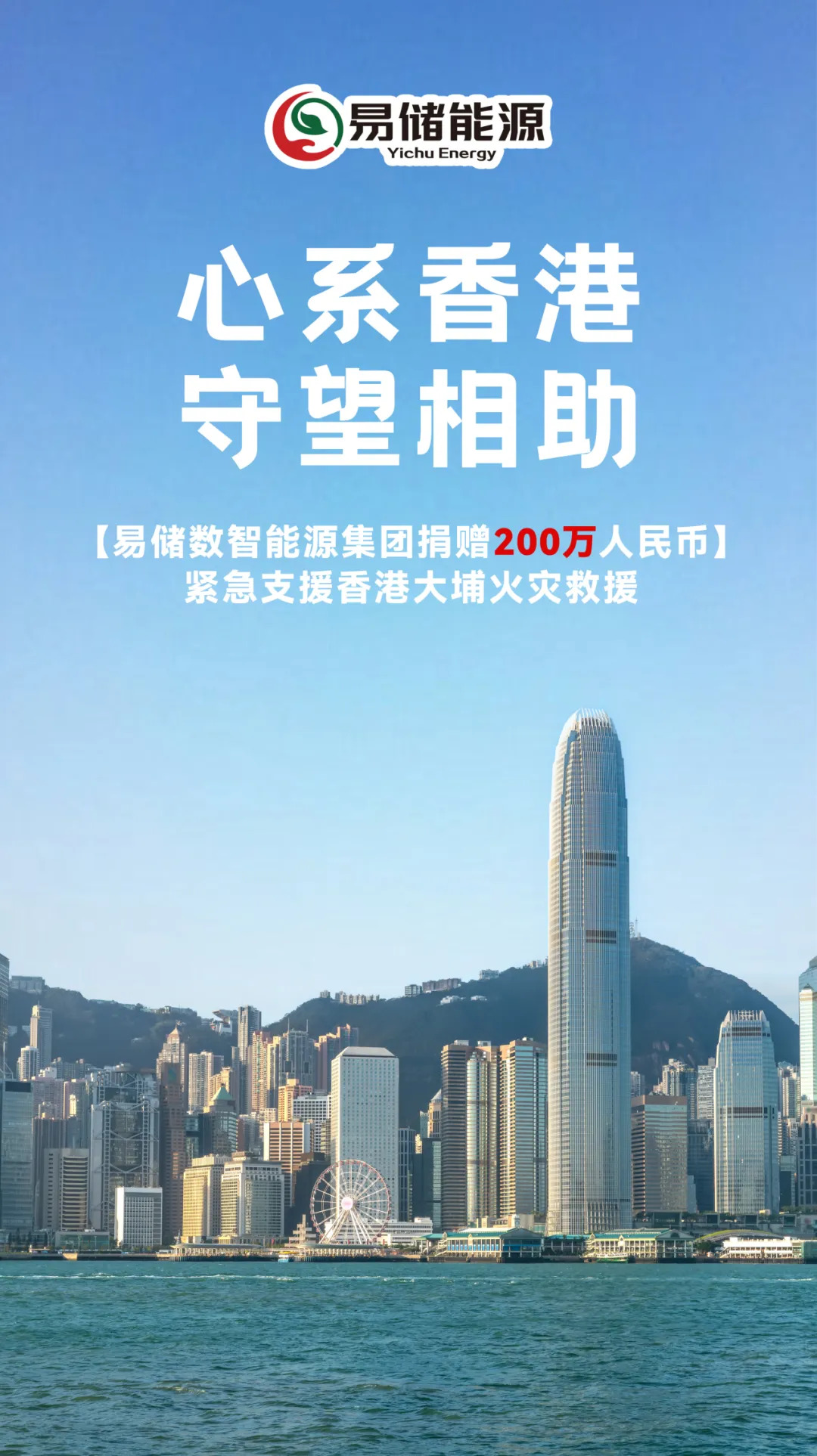 易储能源在12月1日向大埔宏福苑援助基金紧急捐款200万元人民币,用于支援受灾居民安置、社区重建及善后工作。易储能源对遇难者和殉职消防员表示深切哀悼,向遇难者家属及所有受灾市民致以诚挚慰问,并向一线的全体工作人员致以崇高敬意。