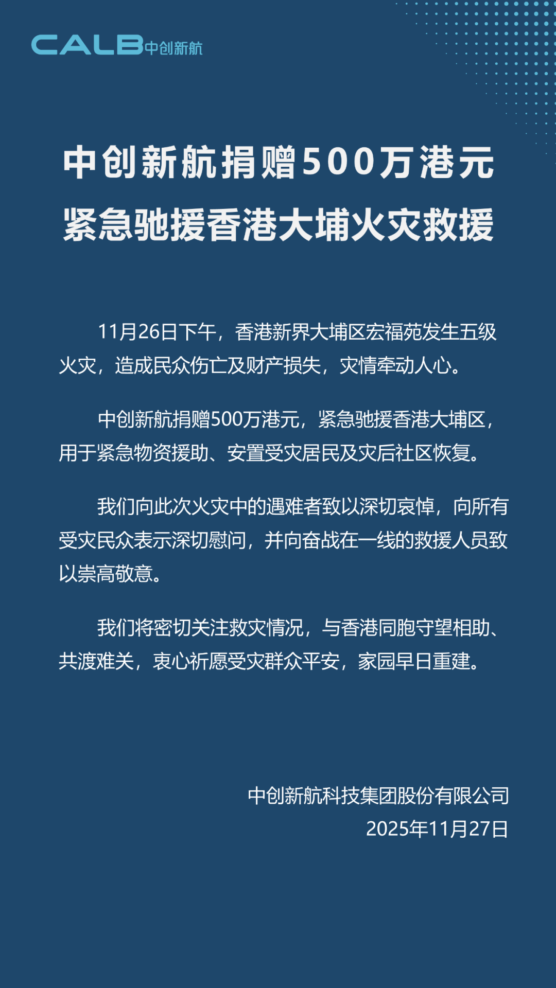 中创新航也在11月27日启动驰援,捐赠500万港元用于紧急物资援助、安置受灾居民及灾后社区恢复。其向火灾遇难者致以深切哀悼,向受灾民众表示深切慰问,向奋一线救援人员致以崇高敬意。中创新将密切关注救灾情况,与香港同胞守望相助,共渡难关。