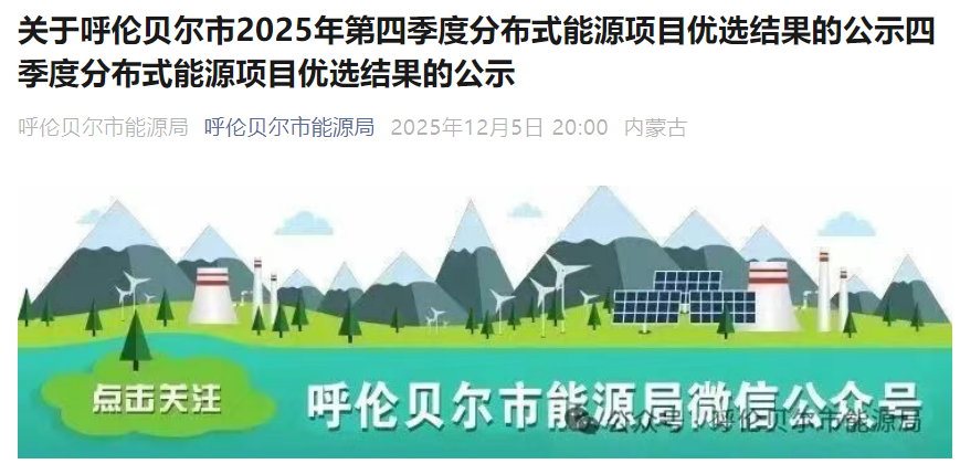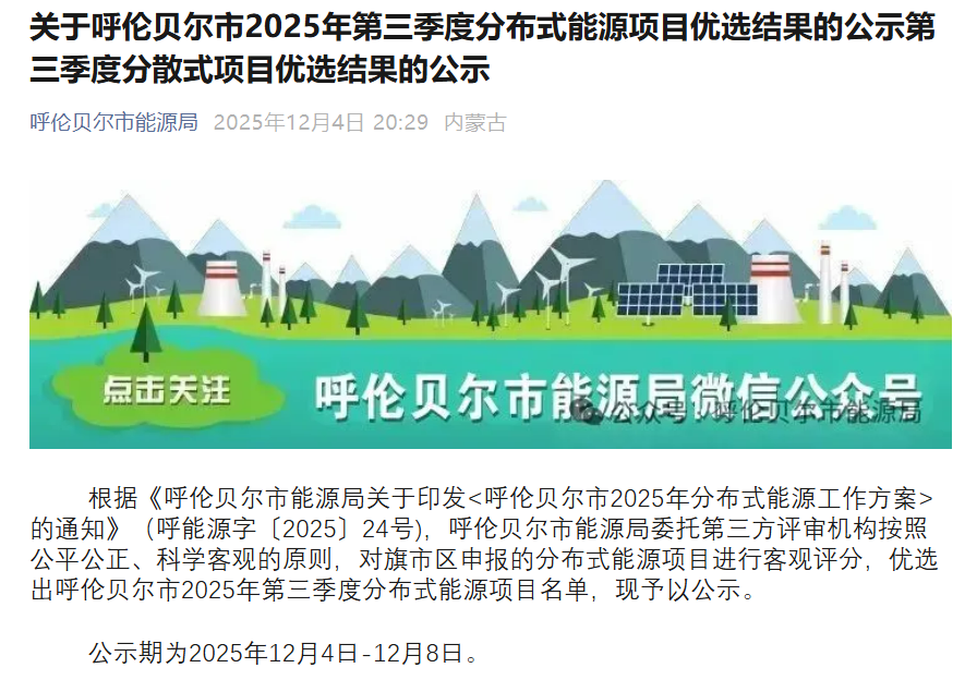 根据《呼伦贝尔市能源局关于印发<呼伦贝尔市2025年分布式能源工作方案>的通知》(呼能源字〔2025〕24号),呼伦贝尔市能源局委托第三方评审机构按照公平公正、科学客观的原则,对各旗市区申报的分布式能源项目进行客观评分,优选出呼伦贝尔市2025年第四季度分布式能源项目名单,现予以公示。