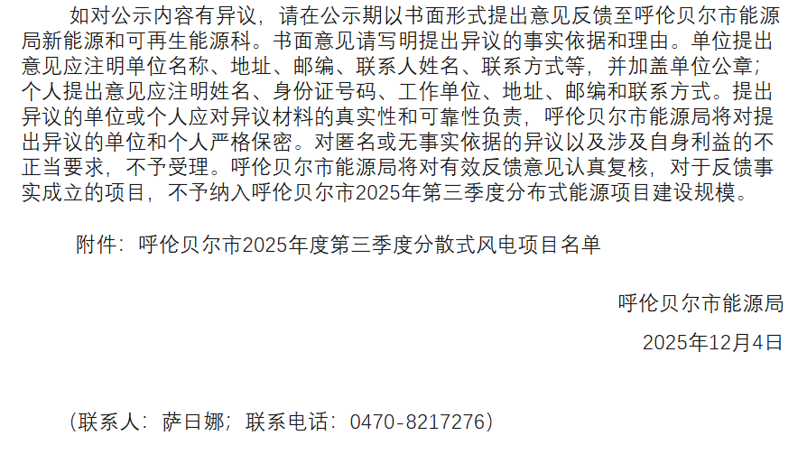 如对公示内容有异议,请在公示期以书面形式提出意见反馈至呼伦贝尔市能源局新能源和可再生能源科。书面意见请写明提出异议的事实依据和理由。单位提出意见应注明单位名称、地址、邮编、联系人姓名、联系方式等,并加盖单位公章;个人提出意见应注明姓名、身份证号码、工作单位、地址、邮编和联系方式。提出异议的单位或个人应对异议材料的真实性和可靠性负责,呼伦贝尔市能源局将对提出异议的单位和个人严格保密。对匿名或无事实依据的异议以及涉及自身利益的不正当要求,不予受理。呼伦贝尔市能源局将对有效反馈意见认真复核,对于反馈事实成立的项目,不予纳入呼伦贝尔市2025年第四季度分布式能源项目建设规模。