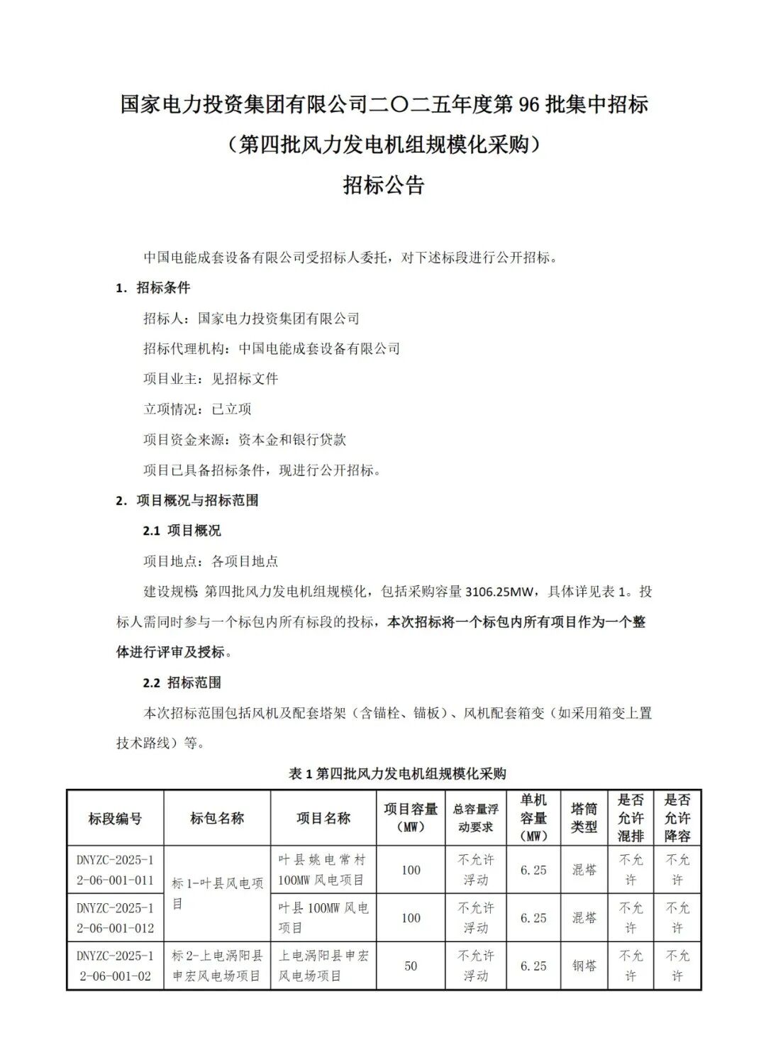 北极星风力发电网获悉,12月6日,国家电投发布《国家电力投资集团有限公司二〇二五年度第96批集中招标(第四批风力发电机组规模化采购)》招标公告。
