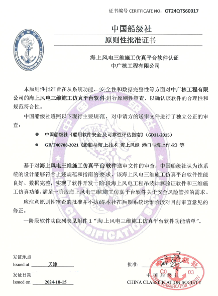 海上风电三维施工仿真平台为中广核工程联合专业团队进行开发,并组织海上风电行业内专家、CCS、DNV、院校等机构,开展软件构架、计算书、阶段成果等专家评审,保障了软件开发过程的质量。