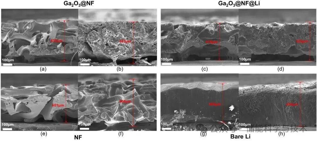 随后对循环前后电极的厚度变化进行了分析。如图6a、b所示,Ga2O3@NF电极在沉积5 mAh cm-2的锂后,厚度仅由430 μm增加至443 μm,增幅为13 μm,且表面仍较为平整,说明大部分金属锂沉积于骨架孔隙中,有效缓解了体积膨胀。相比之下,裸NF电极(图6e、f)在相同锂沉积量下厚度由401 μm增至466 μm,增幅达65 μm,且表面明显起伏不平,这是由于其疏锂性,难以引导锂离子在孔隙内均匀沉积,从而导致不均匀堆积与显著的体积膨胀。