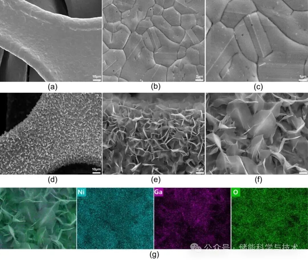 图2 (a) NF的低分辨率SEM图像;(b, c) NF的高分辨率SEM图像;(d) Ga2O3@NF的低分辨率SEM图像;(e, f) Ga2O3@NF的高分辨率SEM图像;(g) Ga2O3@NF的EDS mapping图
