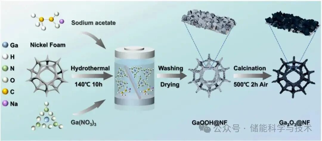 采用水热法和煅烧法将Ga2O3纳米片负载在泡沫镍上。首先用盐酸、丙酮和水对商用泡沫镍(3 cm × 5 cm)分别进行超声波清洗10分钟。将0.52 g Ga(NO3)3·xH2O和0.016 g乙酸钠溶于80 mL水中,剧烈搅拌30分钟形成澄清溶液,随后转移到特氟龙内衬的不锈钢高压反应器中,并在此时将预处理好的泡沫镍放入溶液,斜靠在内壁上,在140 ℃下保存10 h,自然冷却至室温后,用水和无水乙醇彻底清洗极片,并在80 ℃真空烘箱中干燥3 h,GaOOH前驱体沉积在泡沫镍上。随后将前驱体在500 ℃空气中煅烧2 h,最终得到Ga2O3纳米片负载的泡沫镍。