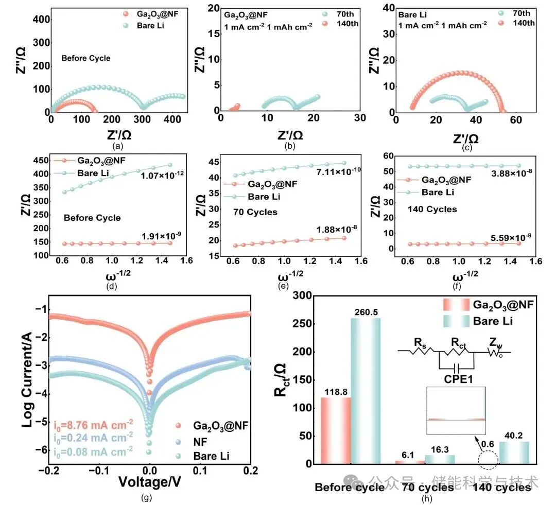 图8 (a~c) Ga2O3@NF@Li和Bare Li对称电池循环不同圈数的EIS曲线;(d~f) Ga2O3@NF@Li和Bare Li对称电池循环不同圈数拟合计算的锂离子扩散系数;(g) Ga2O3@NF@Li、NF@Li和Bare Li的塔菲尔曲线;(h) Ga2O3@NF@Li和Bare Li对称电池的EIS拟合结果及其相应拟合等效电路