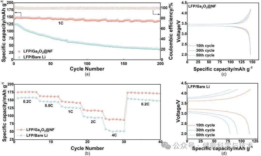 图9 (a) LFP/Ga2O3@NF、LFP/Bare Li全电池在1C循环下的电化学性能;(b) LFP/Ga2O3@NF、LFP/Bare Li全电池在1C循环下的倍率性能;(c, d) LFP/Ga2O3@NF、LFP/Bare Li全电池在不同圈数下的充放电曲线