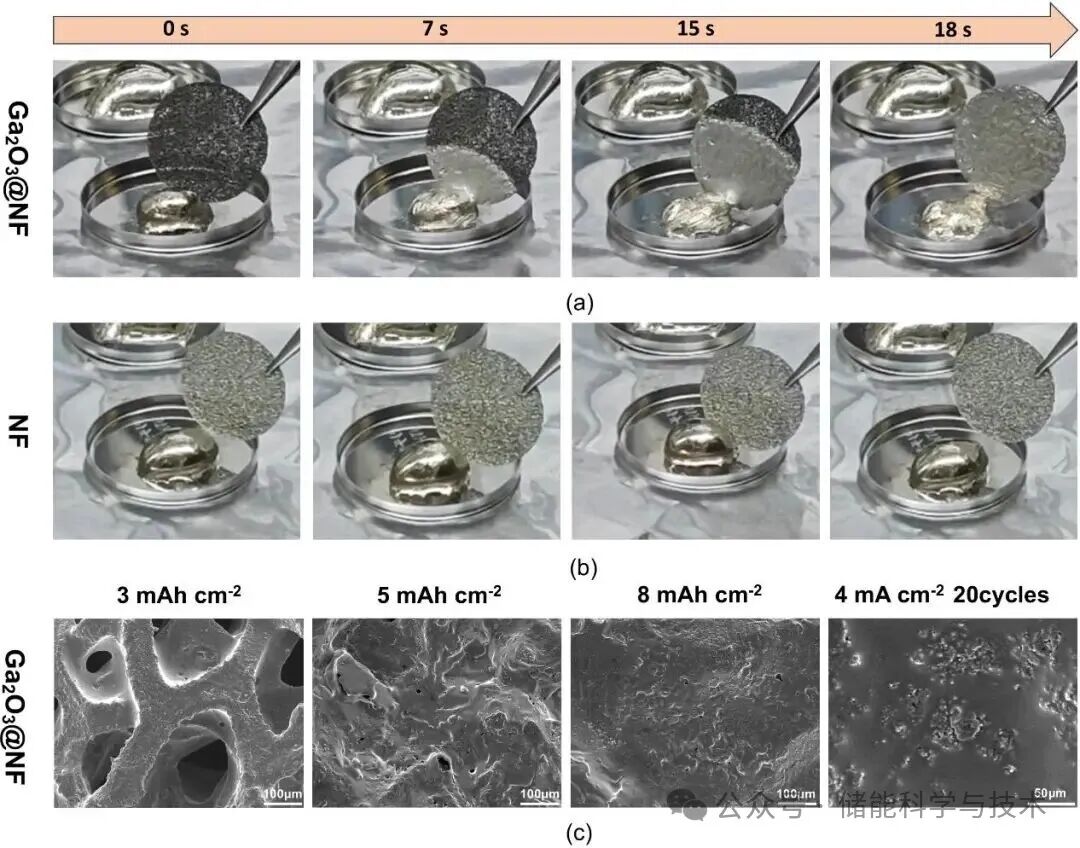 图5 (a, b) Ga2O3@NF与NF吸收熔融锂的图;(c)在Ga2O3@NF上沉积不同面容量的Li和以4 mA cm-2的电流密度循环20圈的扫描电镜图