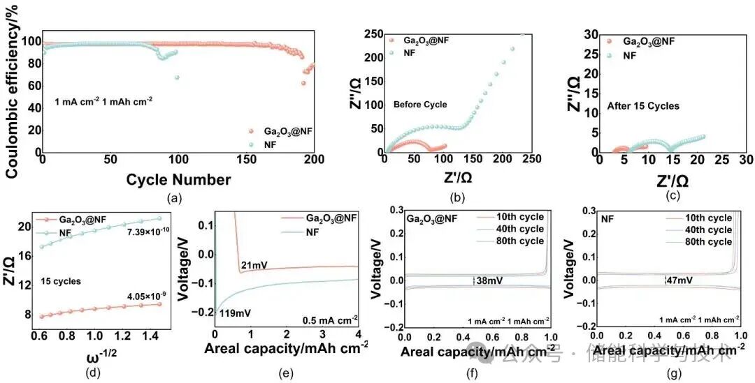 图4 (a) 1 mA cm-2电流密度和1 mAh cm-2面积容量测试条件下Ga2O3@NF与NF的CE测试图;(b, c)半电池循环前与循环15圈的EIS曲线;(d)半电池循环15圈后拟合计算的锂离子扩散系数;(e) 0.5 mA cm-2电流密度和4 mAh cm-2面积容量下Ga2O3@NF与NF电极上第一次Li沉积的电压曲线;(f, g) Ga2O3@NF与NF电极表面Li沉积/剥离的电压曲线