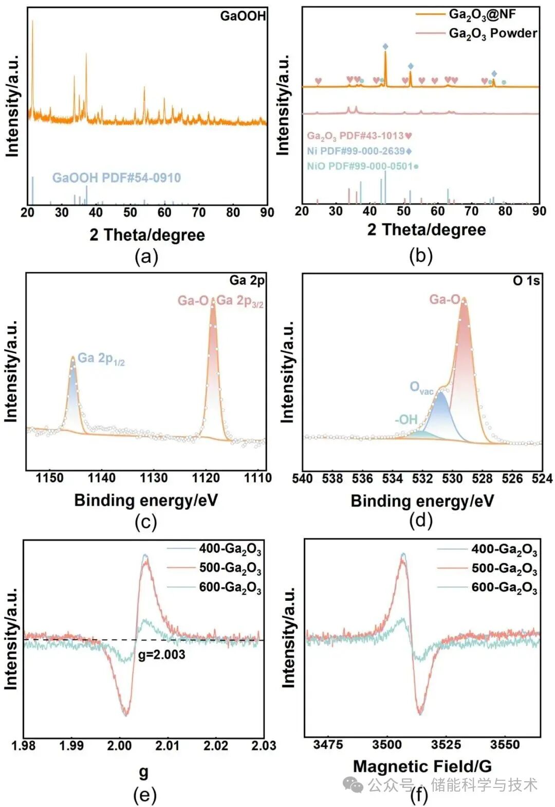图3 (a) GaOOH前驱体的XRD图;(b) Ga2O3@NF的XRD图;(c) Ga2O3@NF的 Ga 2p XPS图;(d) Ga2O3@NF的 O 1s XPS图;(e,f) Ga2O3@NF的EPR图
