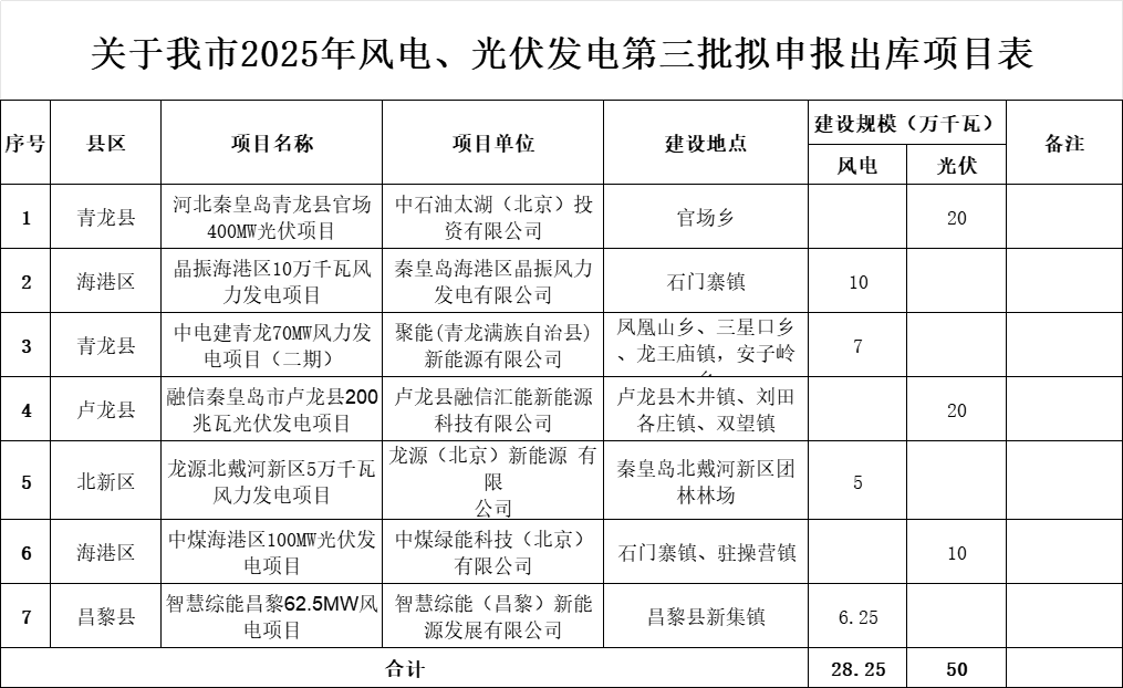 根据披露,此次共涉及青龙县、海港区、卢龙县、北新区、昌黎县等地区7个风、光项目,新能源规模共计78.25万千瓦,其中风电28.25万千瓦,光伏50万千瓦。