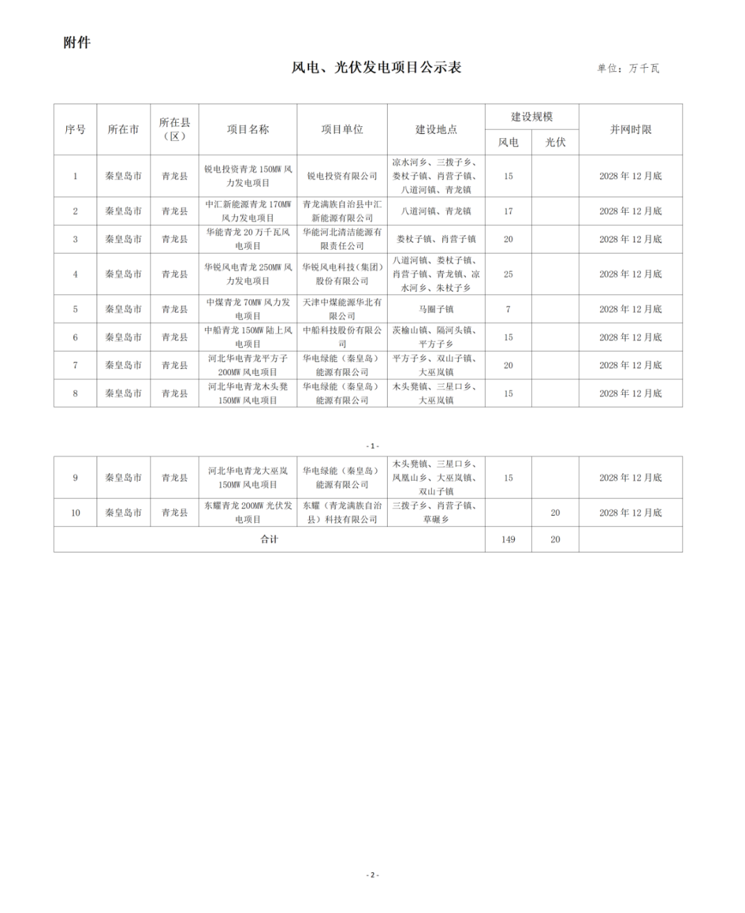 根据公示,本次共有10个项目,规模共计169万千瓦。其中,风电项目9个,149万千瓦;光伏项目1个,20万千瓦。