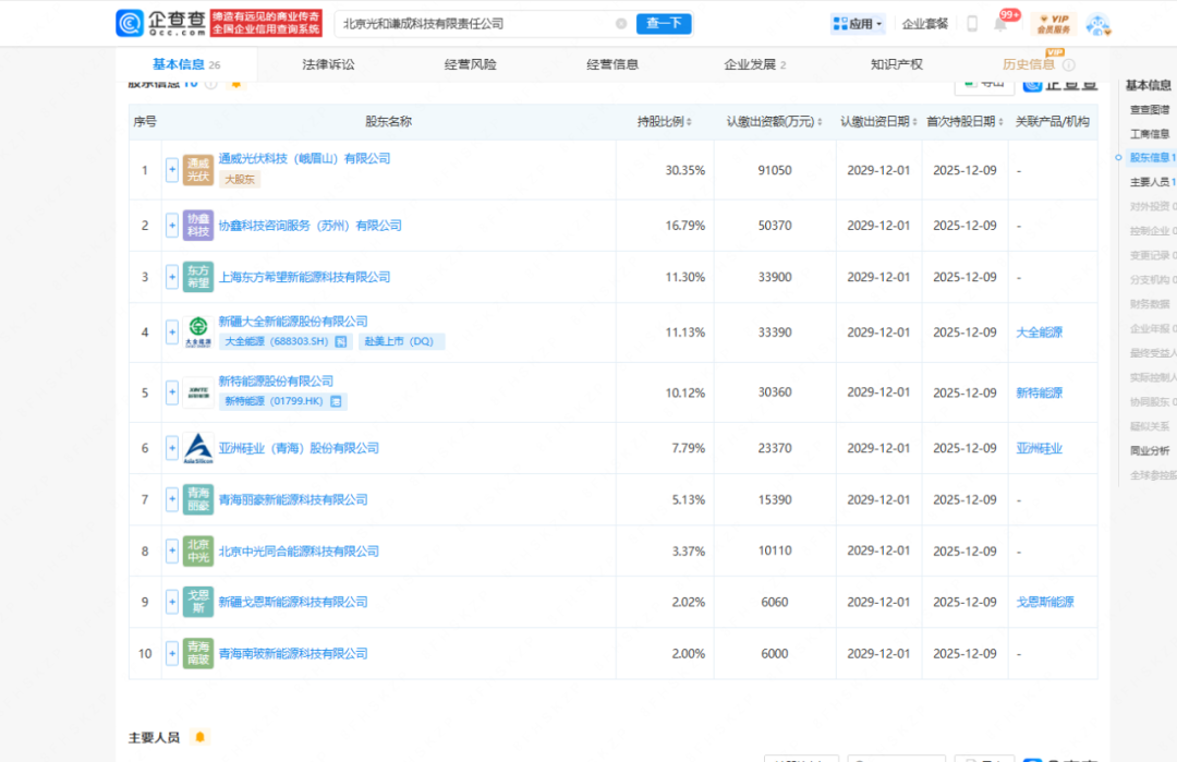值得关注的是,刚刚,企查查上北京光和谦成的详细股权结构已然明晰,十大股东包含通威、东方希望、大全、新特能源、亚洲硅业、戈恩斯、南玻、丽豪以及北京中光同合能源科技有限公司、协鑫科技咨询服务(苏州)有限公司。其中通威为第一大股东,持股比例30.35%。北京中光同合能源科技有限公司实控人为中国光伏行业协会。