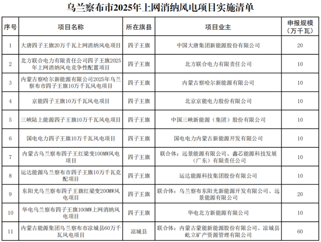 根据公示,乌兰察布市2025年上网消纳风电项目共11个,规模共计180万千瓦。