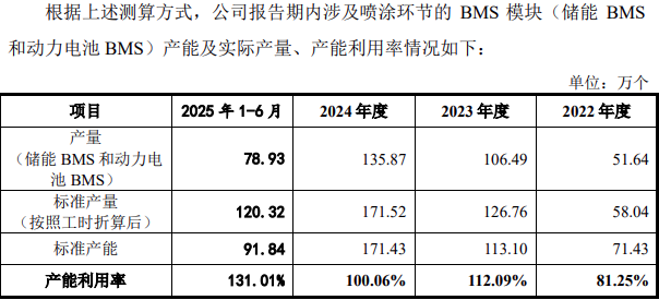 高特电子表示,2023年以来,公司产能利用率持续保持高位运行,其中2023年、2024年其产能利用率均超过100%。根据招股书披露的数据,高特电子2024年的标准产能为171.43万个,实际标准产量为171.52万个、产能利用率达100.06%,其中储能BMS与动力电池BMS产量为135.87万个。