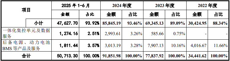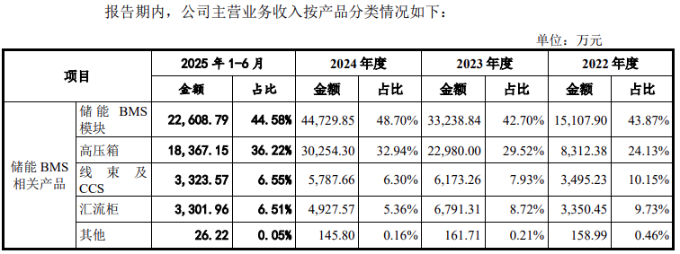 根据高特电子招股书披露,在2022年、2023年、2024年及2025上半年期间,公司总营收分别为3.46亿元、7.79亿元、9.19亿元、5.07亿元,其中储能BMS模块、高压箱、汇流柜、一体化集控单元及数据服务等核心技术产品收入分别达2.68亿元、6.36亿元、8.29亿元、4.56亿元,在主营业务收入占比分别为77.73%、81.69%、90.26%及89.82%,销售收入占比逐年增加。