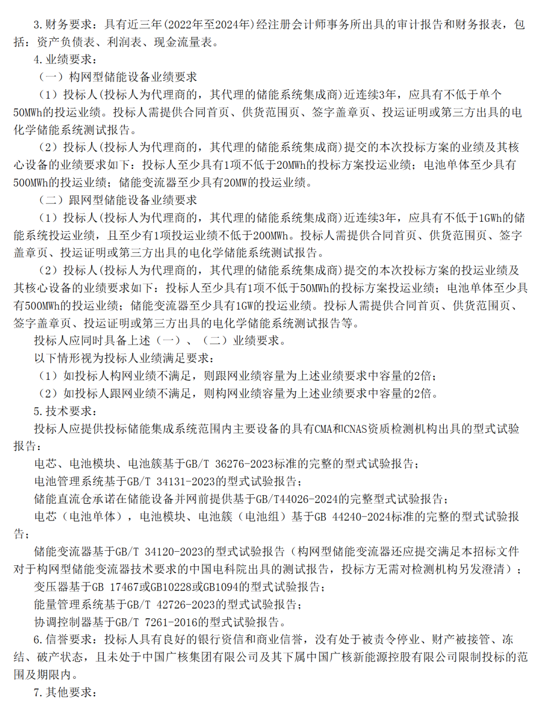 跟网型储能方面,近连续3年,应具有不低于1GWh的储能系统投运业绩,且至少有1项投运业绩不低于200MWh。本次投标方案的投运业绩及其核心设备的业绩要求如下:投标人至少具有1项不低于50MWh的投标方案投运业绩;电池单体至少具有500MWh的投运业绩;储能变流器至少具有1GW的投运业绩。