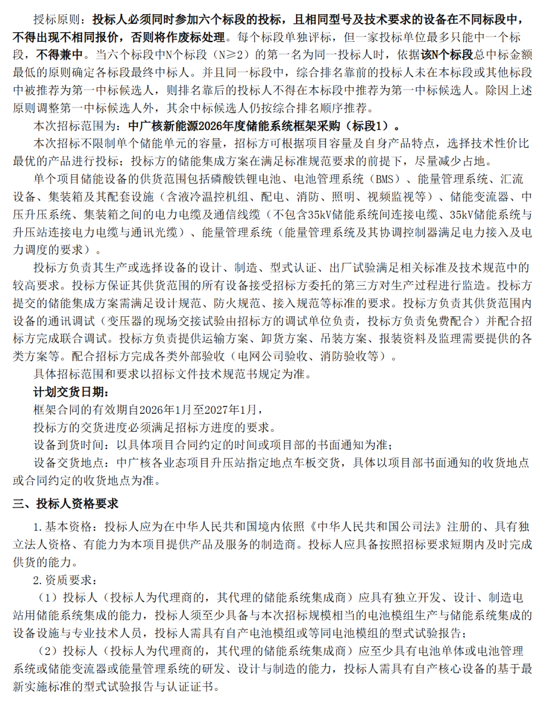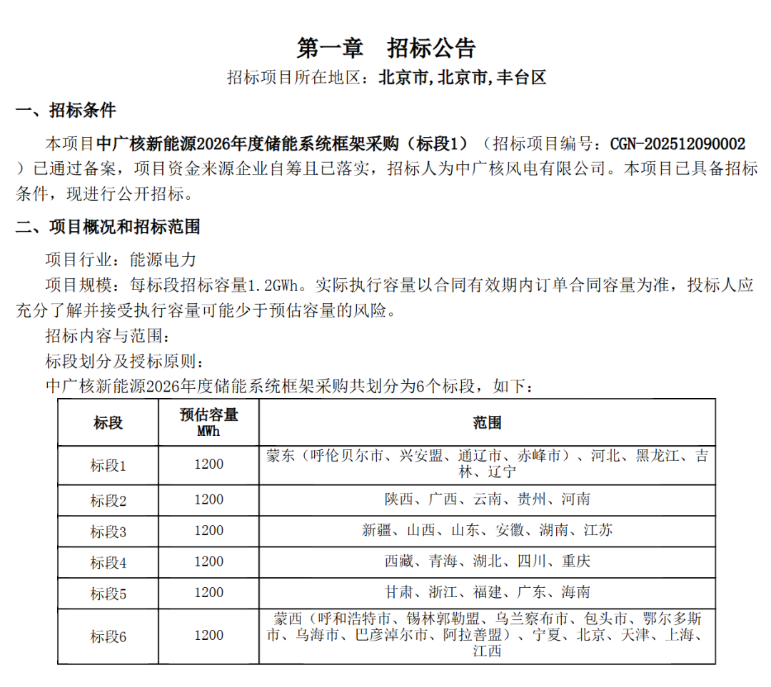 北极星储能网讯:12月12日,中广核新能源启动2026年度储能系统框采,此次框采共分为六个标段,每个标段覆盖不同区域、预估采购容量1.2GWh,合计总采购需7.2GWh。框架合同的有效期自2026年1月至2027年1月。