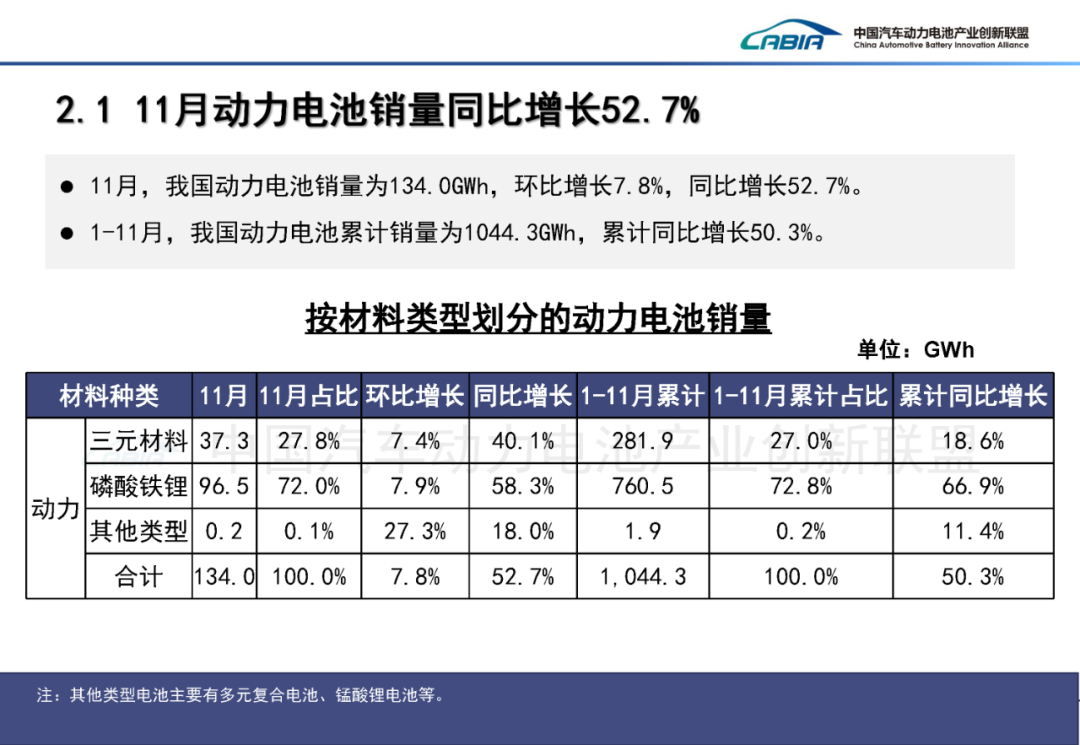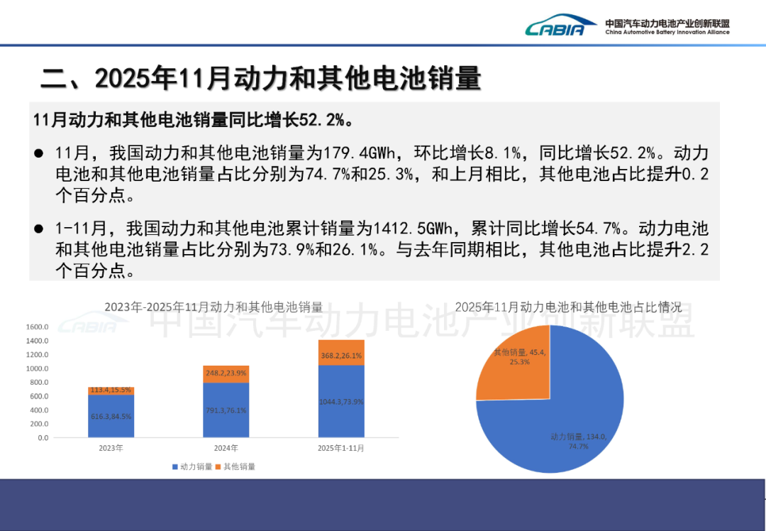 11月,我国动力和其他电池销量为179.4GWh,环比增长8.1%,同比增长52.2%。其中,动力电池销量为134.0GWh,占总销量74.7%,环比增长7.8%,同比增长52.7%;其他电池销量为45.4GWh,占总销量25.3%,环比增长8.9%,同比增长50.7%。