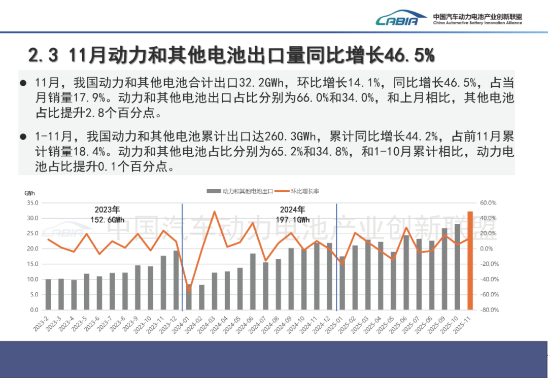 11月,我国动力和其他电池合计出口32.2GWh,环比增长14.1%,同比增长46.5%。合计出口占当月销量17.9%。其中,动力电池出口量为21.2GWh,占总出口量66.0%,环比增长9.4%,同比增长70.2%;其他电池出口量为10.9GWh,占总出口量34.0%,环比增长24.4%,同比增长15.3%。