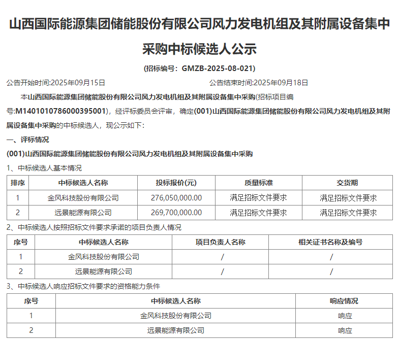 北极星风力发电网获悉,9月15日,山西国际能源集团储能股份有限公司风力发电机组及其附属设备集中采购中标候选人公示,规模共计150MW,金风科技预中标,投标报价27605万元。