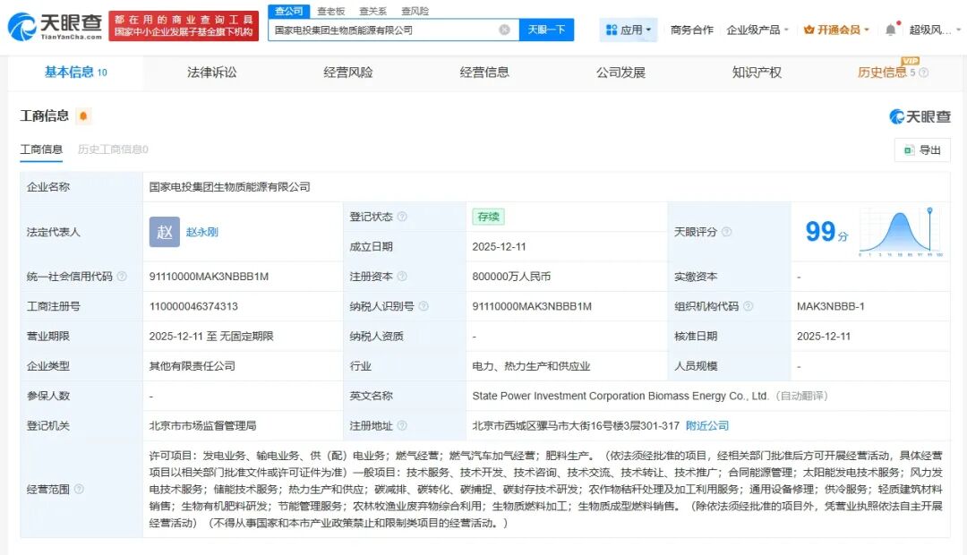 天眼查工商信息显示,近日,国家电投集团生物质能源有限公司成立,注册资本80亿元人民币,经营范围包括太阳能发电技术服务、风力发电技术服务、储能技术服务、生物质燃料加工、生物质成型燃料销售等。