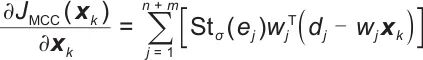 与传统卡尔曼滤波一样,本节的算法过程分为时间更新和量测更新2个部分,主要是对原有的先验误差协方差矩阵和量测噪声协方差矩阵进行MCC下的加权修改,算法推导过程如下: