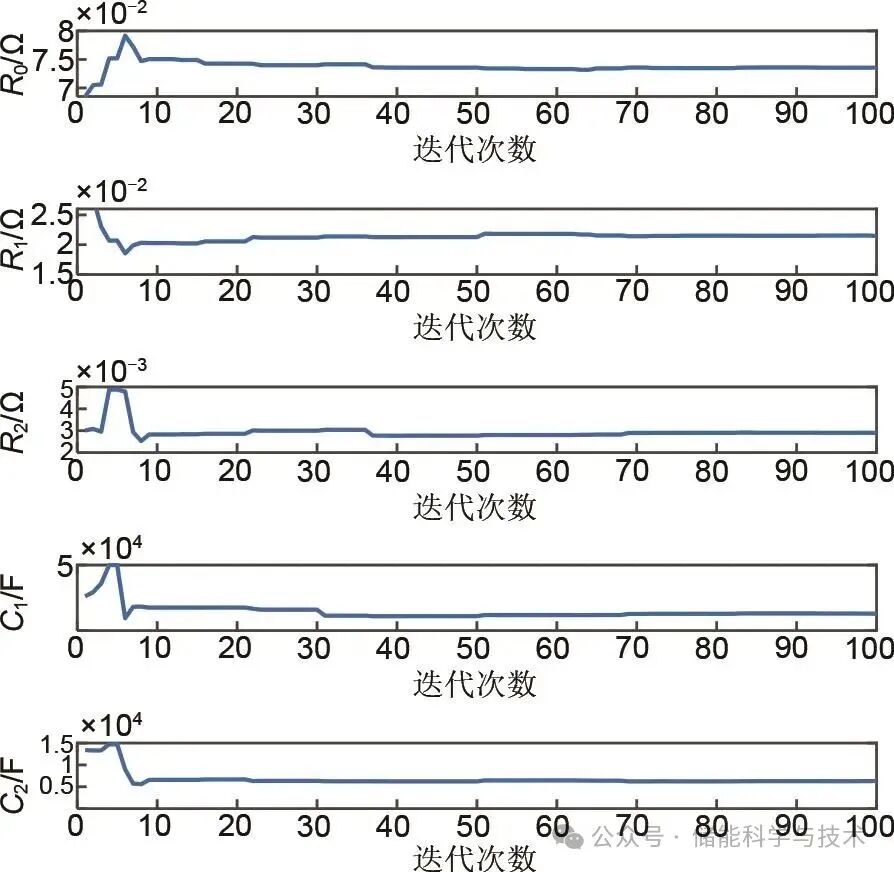 通过以最小化适应度函数为目标完成以上搜寻过程,可以得到最佳的沙猫位置,即模型参数的最佳辨识值。以常温下FUDS工况数据为例,使用SCSO进行参数辨识,得到的辨识结果如图2所示。在辨识初期参数变化较为剧烈,但是可以发现经过10次少量迭代后,辨识参数开始稳定下来。将参数辨识结果