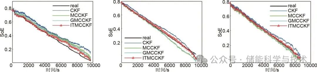图5是环境3下各算法估计结果,从图中可以看出,ITMCCKF算法估计效果最好,其次分别是GMCCKF、MCCKF和CKF算法。由于加入的噪声种类和程度增加,CKF估计结果较之前2种环境波动更为剧烈,估计结果全程都在真实值附近大范围上下浮动,此时传统CKF已经不适用于实际的SoE估计。尽管MCCKF和GMCCKF估计效果优于CKF,但是由于其不能很好地处理来自多种分布的非高斯噪声,估计结果离真实值偏差较大。与之相反的是,ITMCCKF可以充分利用高阶信息进行对应各个误差元素的学生t核函数值计算,通过改变分布的形状和核宽度大小灵活地处理来自不同分布的非高斯过程噪声和量测噪声,从而显著提升了算法的估计精度和鲁棒性。