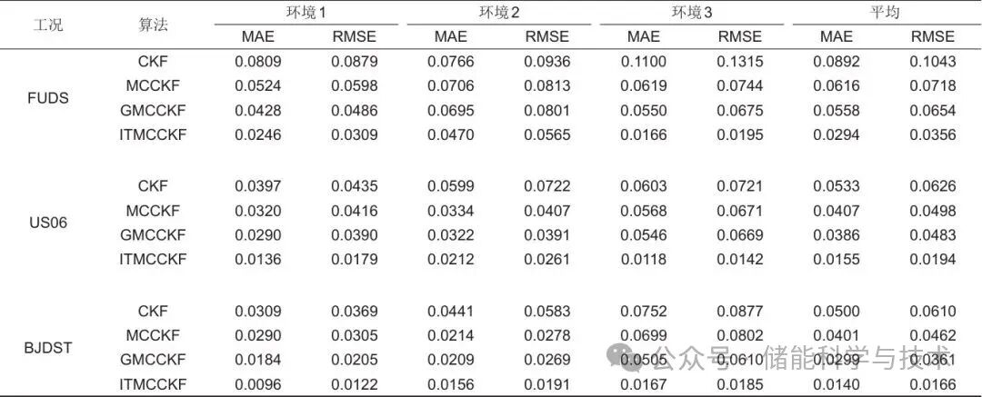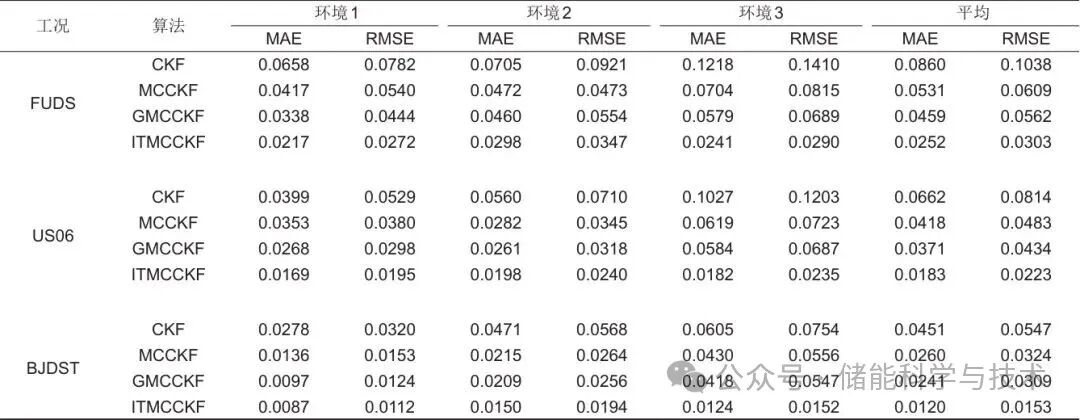 为了直观地分析算法的估计精度和鲁棒性,表1给出了各算法的统计误差指标,包括平均绝对误差(mean absolute error, MAE)和均方根误差(root mean square error, RMSE)。由表1可以看出,ITMCCKF算法在各工况不同非高斯噪声环境下均取得了较好的SoE估计精度。具体来说,在FUDS、US06、BJDST工况下,ITMCCKF算法在3种噪声环境下的平均RMSE相较于CKF算法分别降低了70.8%、72.6%、72.0%;相较于MCCKF算法分别降低了50.2%、53.8%、52.8%;相较于GMCCKF算法分别降低了46.1%、48.6%、50.5%。随着非高斯噪声程度的加深和种类的增多,ITMCCKF算法始终保持着较低的SoE估计误差,验证了所提算法的有效性。