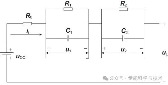 等效电路模型可以很好地模拟电池充放电的动、静态特性,具有较高的精度和计算效率等优点,在实验研究中得到了广泛的应用。考虑在计算精度和计算复杂度之间进行权衡,本工作采用二阶RC等效电路模型来模拟电池极化效应导致的瞬时压降和电压松弛现象,如图1所示。
