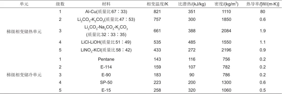 本研究运行所采取的参数及条件见表1。梯级相变储热/冷单元各级采用的相变材料见表2。