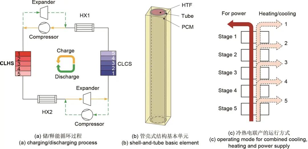 上述研究主要聚焦于卡诺电池的储放电功能。实际上,基于热-电能量转换原理,卡诺电池可拓展为冷热电联产系统。其中,梯级相变储热/冷技术的应用显著提升了系统能量输出的品位多样性,实现电能与不同品位热能/冷能的多维耦合输出。Zhao等分析了梯级相变储热/冷系统总级数、级面积以及管内流速等设计参数对系统往返效率和㶲效率的影响,发现其热力学性能可与基于堆积床显热和液体显热储热/冷的卡诺电池系统相媲美,且灵活性更强。此外,该系统具备作为能源枢纽多能管理平台的潜力,有效解决能源供需匹配问题,在案例分析中综合能量利用系数高达119%。然而,由于涉及多种能量形式及品位的复杂耦合,其动态特性尚不明确,尤其是不同能量品位间的动态耦合机制仍待深入研究。
