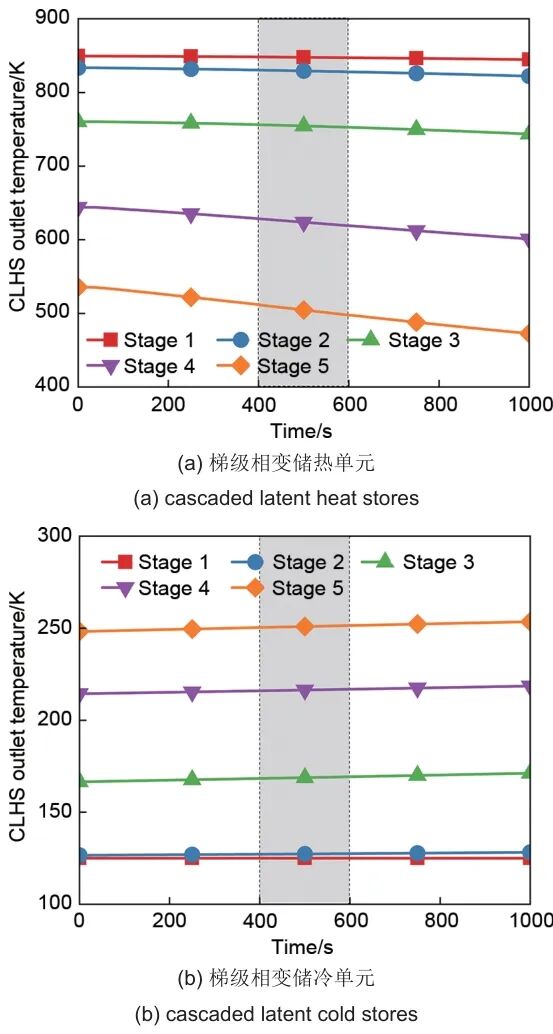 输出电功率在400 s和600 s未发生波动,这是因为用于供电的工质流量与供热/冷工质流量无关,并且,工质逐级流经梯级相变储热/储冷单元后,出口温度波动逐级减小,梯级相变储热/储冷单元能够缓冲因供热/冷工质流量扰动引起的温度变化,从而稳定供电工质的温度。因此,供热/冷功率的瞬时扰动不会引起电功率的波动。