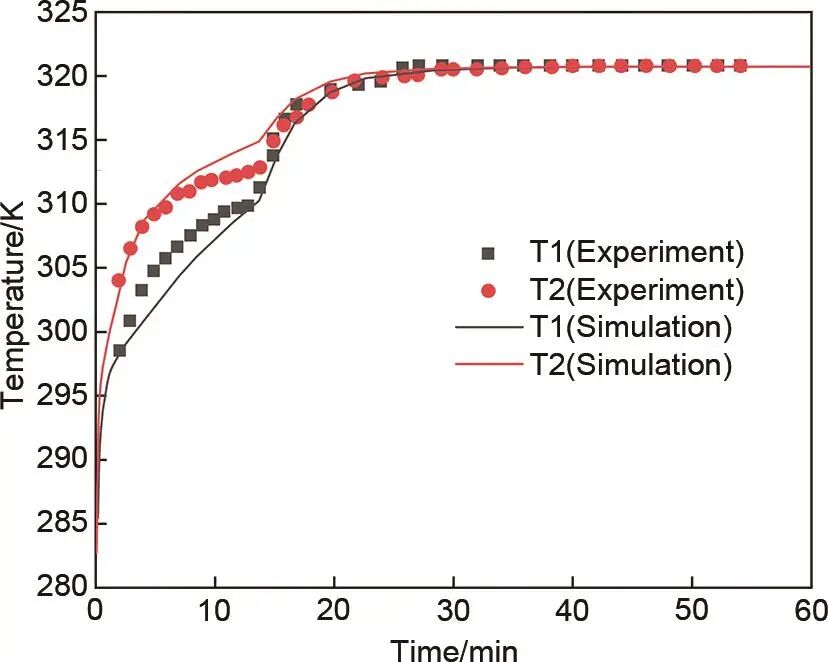 本研究所采用的压缩机、膨胀机及换热器模型已在相关文献中得到验证。梯级相变储热/冷单元的数值结果与文献实验结果进行了对比,如图2所示,发现两个参考点的PCM温度与实验值吻合良好,相对温差在2%以下。