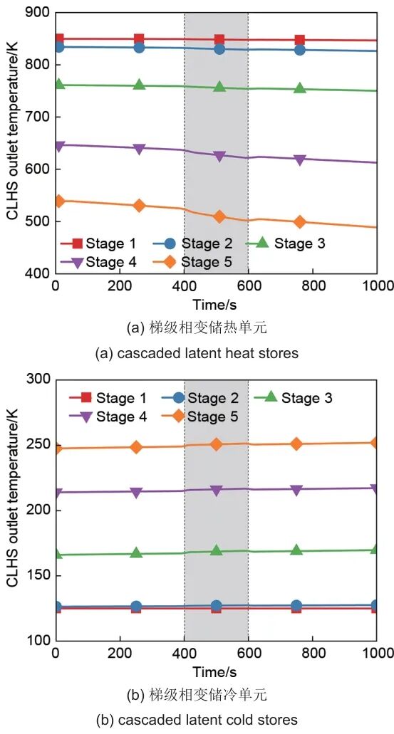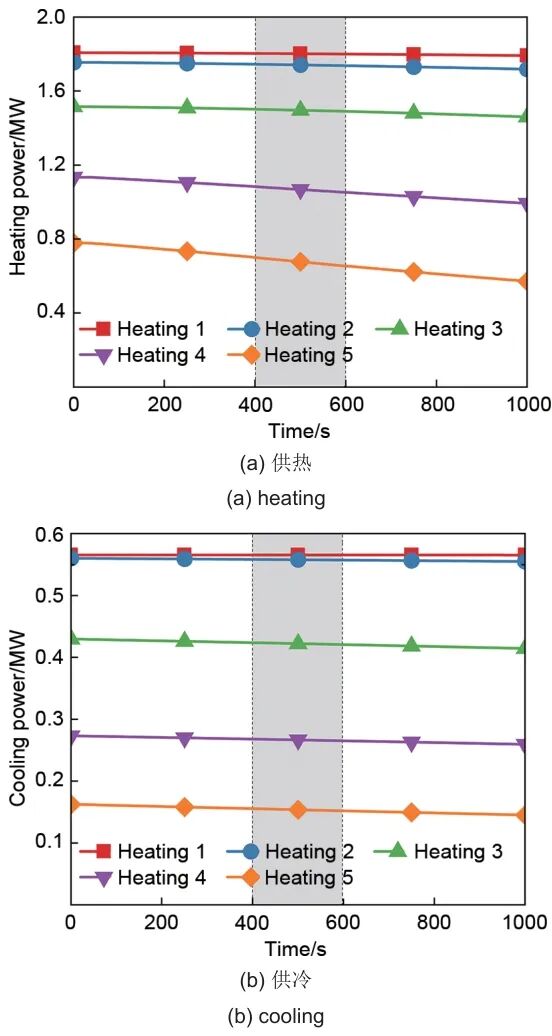 在400 s和600 s电负载变化时,如图中的阴影部分所示,不同品位的供热/冷功率与供热温度未发生显著波动。由于梯级相变储热/冷单元的总质量流量为供电质量流量与供热/冷质量流量之和,且仅变化约2%,流速变化较小,对流换热系数变化约1.8%,因此换热效果差异不显著,出口温度未发生明显变化。