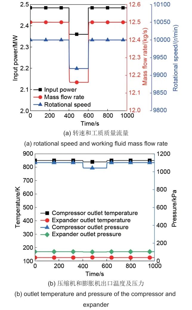 为探究输入电功率波动对系统运行的影响,仿真中将输入电功率在0~400 s期间保持设计值,400 s时骤降5%至2.36 MW,600 s时恢复至设计值2.48 MW。图3(a)展示了压缩机和膨胀机轴转速及工质质量流量的变化情况。结果表明,当输入功率下降时,转速与质量流量均迅速下降:转速在20 s内由10000 r/min下降至9919 r/min,质量流量由12.50 kg/s降至12.16 kg/s;随后在600 s输入功率恢复后,转速和质量流量分别回升至10000 r/min和12.50 kg/s。