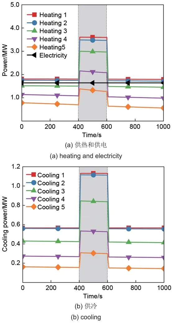 图5 释能过程各级供热功率和供冷功率随电负载功率扰动的变化