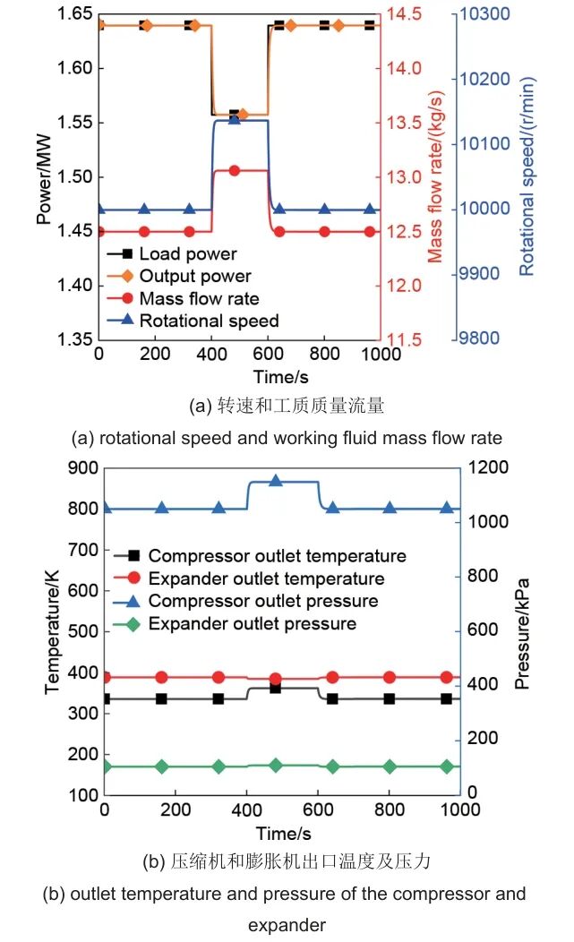 图4(a)展示了压缩/膨胀机轴转速及工质质量流量的变化情况。当用电负载突然下降时,转速从10000 r/min上升至10137 r/min,质量流量从12.50 kg/s增加至13.06 kg/s。输出电功率在30 s内逐步降低至负载功率1.56 MW。随着电负载在600 s时的回升,转速和质量流量也随之恢复至设计值。根据式(14),当用电负载骤然减小时,膨胀机输出功we和压缩机耗功wc短时间内保持不变,产生与旋转角速度相同的角加速度,导致轴转速增加。质量流量也随着转速的增加而增大,但系统净输出功we-wc逐渐降低,转轴的角加速度逐渐消失,最终使转速增加至10137 r/min,并保持稳定。