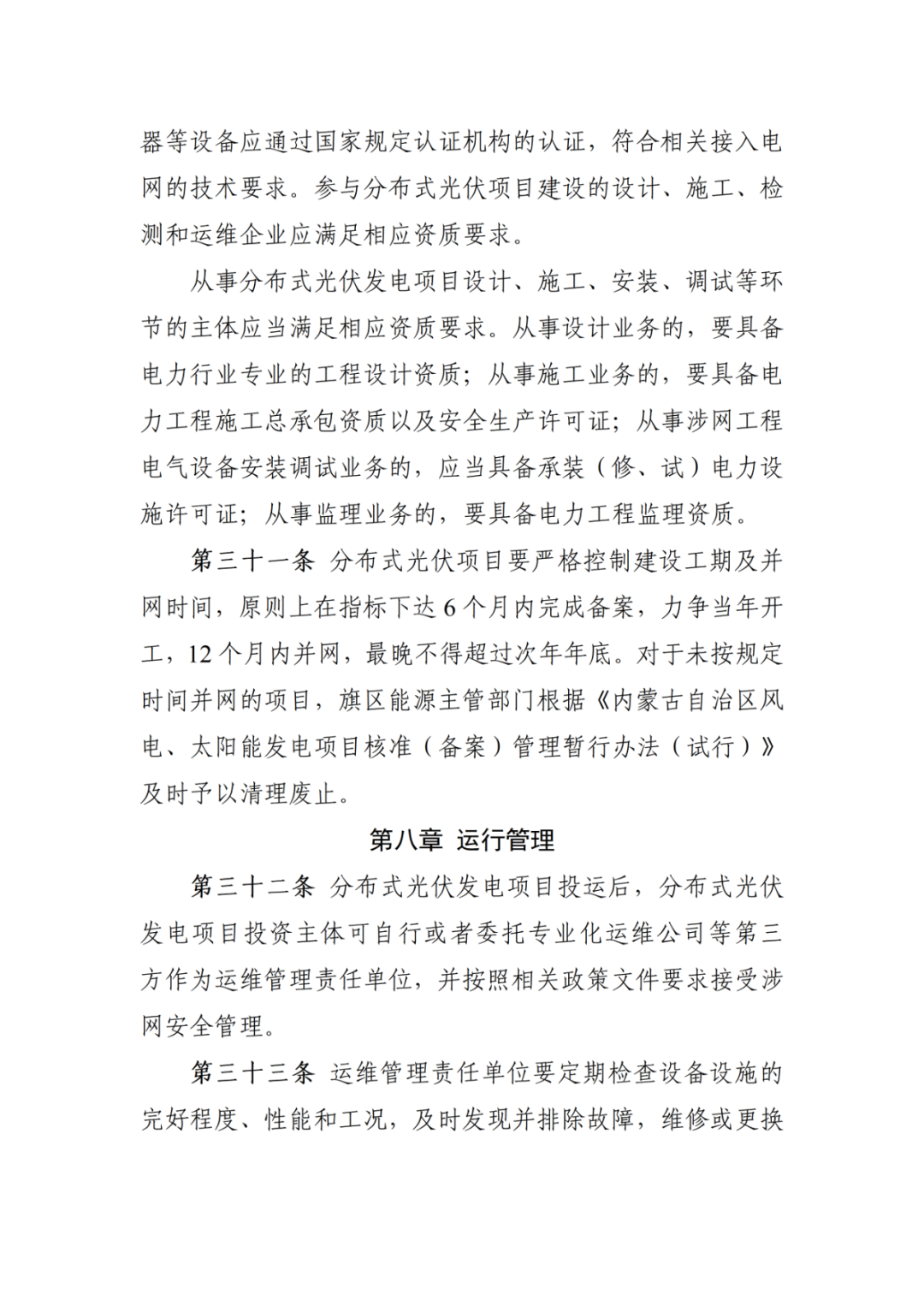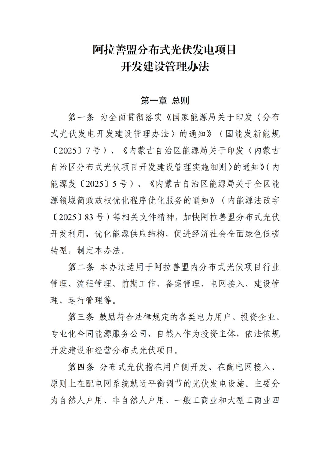根据《国家能源局关于印发〈分布式光伏发电开发建设管理办法〉的通知》(国能发新能规〔2025〕7 号)、《内蒙古自治区能源局关于印发〈内蒙古自治区分布式光伏项目开发建设管理实施细则〉的通知》(内能源发〔2025〕5 号)、《内蒙古自治区能源局关于全区能源领域简政放权优化程序优化服务的通知》(内能源法改字〔2025〕83 号)等政策文件,开展公平竞争审查、合法性审查,并广泛征求意见,盟能源局制定了《阿拉善盟分布式光伏发电项目开发建设管理办法》,现公开印发,请各单位及企业认真执行。