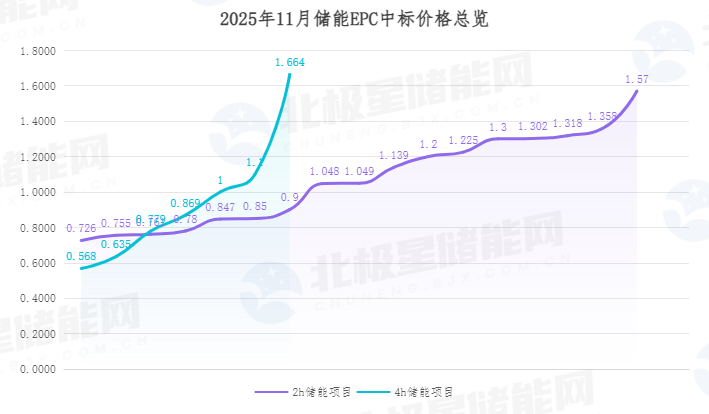 2025年11月,储能EPC报价较上个月再次上调回升。其中2h储能EPC投标价格为0.7553-1.5863元/Wh,平均投标价格为1.077元/Wh,环比上升0.37%;2h储能EPC中标价格范围为0.7553-1.5737元/Wh,平均中标价格为1.04元/Wh,环比上升13.1%;