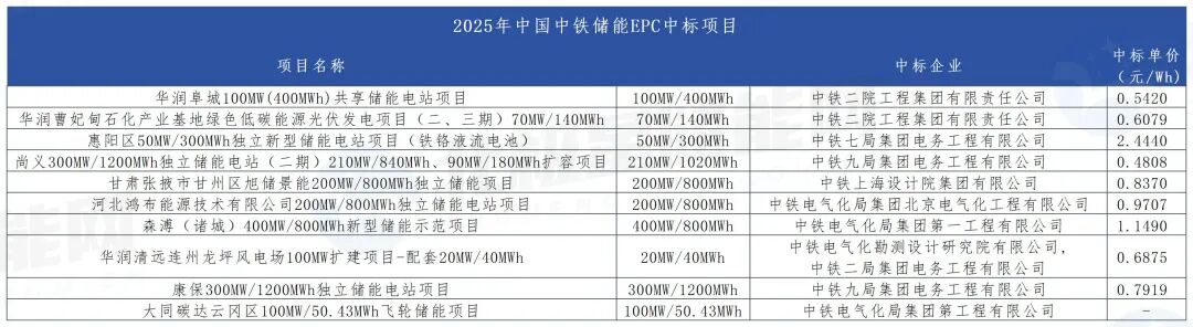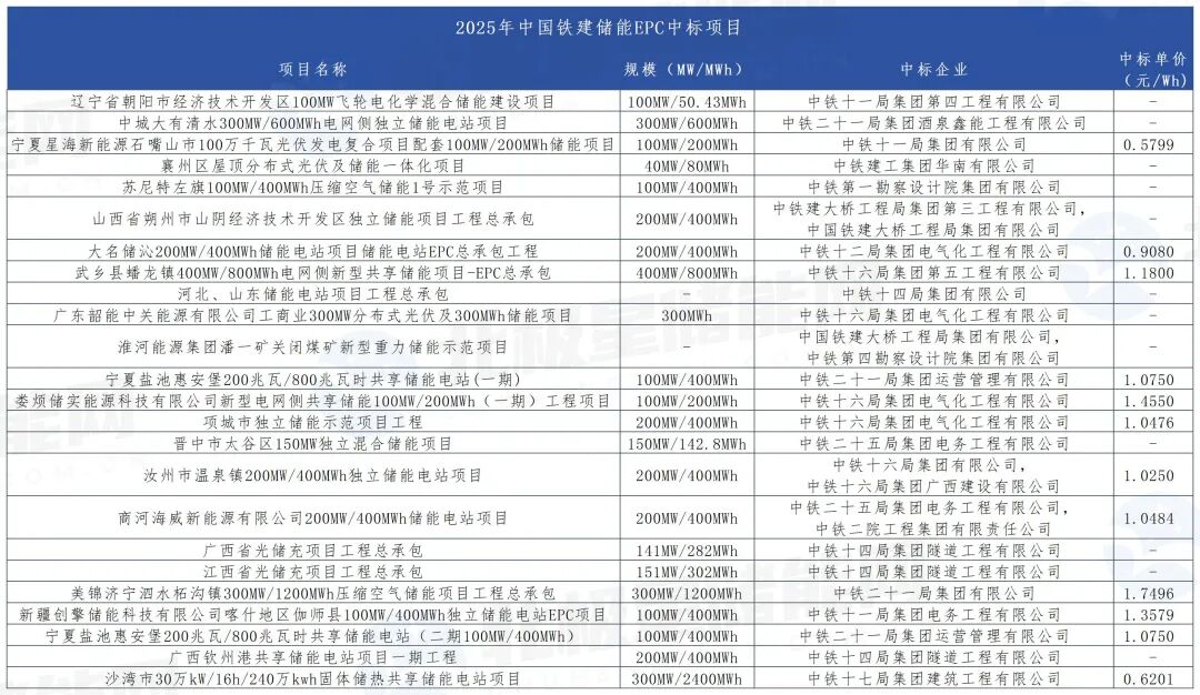 中国铁建2025年一共参与30次储能EPC投标,中标24个项目、总中标金额156.34亿元,平均中标价为1.1302元/Wh。