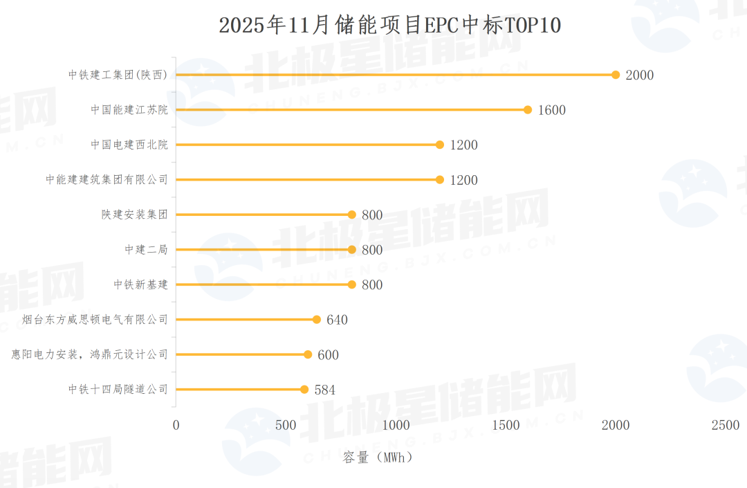 在11月国内储能EPC市场竞争中,中铁建工集团(陕西)表现亮眼,以中标新疆阿克苏库车500MW/2000MWh构网型独立储能项目,稳居中标榜首。