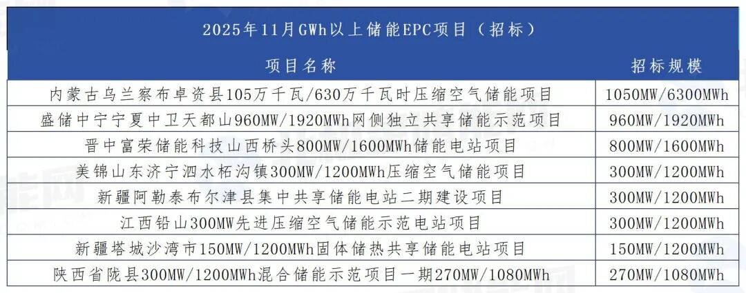 值得注意的是,11月储能EPC招标中共有9个项目招标规模超过GWh,合计达到15.7GWh,且有四个项目采用了非锂电池储能技术,包括三个压缩空气储能及一个固体储热储能。